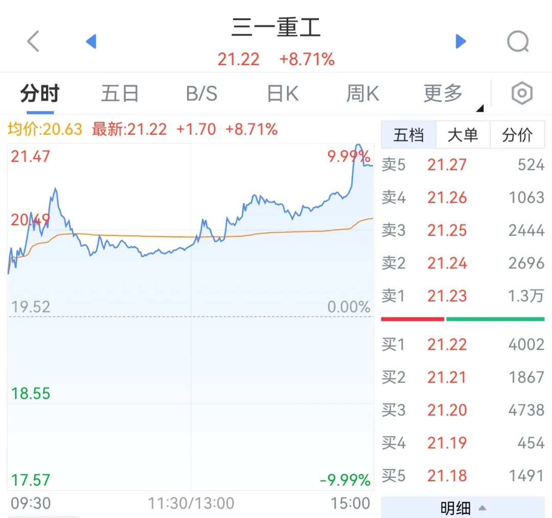 7月22日,临近A股收盘,三一重工、中联重科等工程机械龙头股突然暴力拉升。其中,三一重工一度触及涨停。截至收盘,工程机械板块整体涨幅超过6%,铁建重工、厦工股份、山河智能等超10只个股涨停,三一重工涨近9%,中联重科涨近8%。